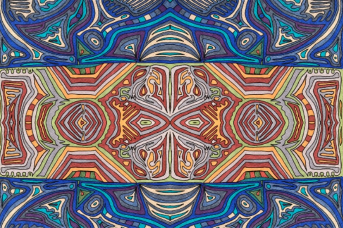 Les créations originales sont numérisées et traitées en effet "miroir" afin d'obtenir le principe de l'image en kaléidoscope